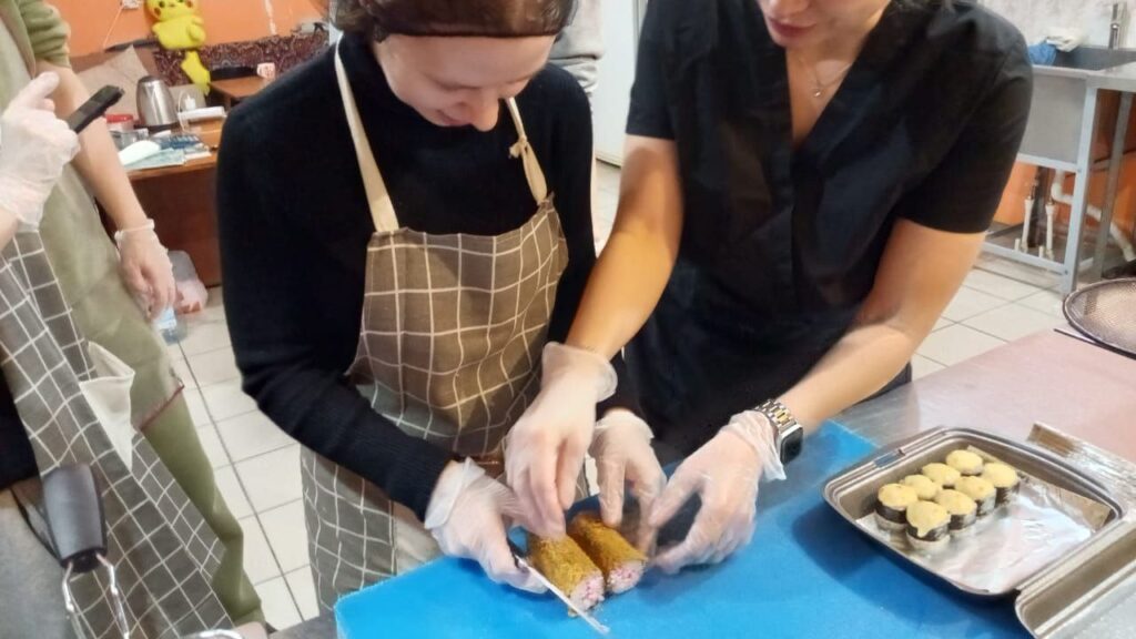 Под чутким руководством руководителя предприятия Кузнецовой Ульяны Александровны и управляющей Гайнутдиновой Дарьи Николаевны обучающиеся раскрыли для себя секреты приготовления блюд кухни быстрой доставки – роллов и пиццы. Ребята с неподдельным интересом осваивали приемы приготовления роллов: от тончайшей нарезки ингредиентов до техники формирования рисового слоя; узнали об особенностях приготовления ароматной пиццы. В завершение этого интересного и вкусного мастер-класса студенты смогли попробовать роллы и пиццу, приготовленные своими руками.